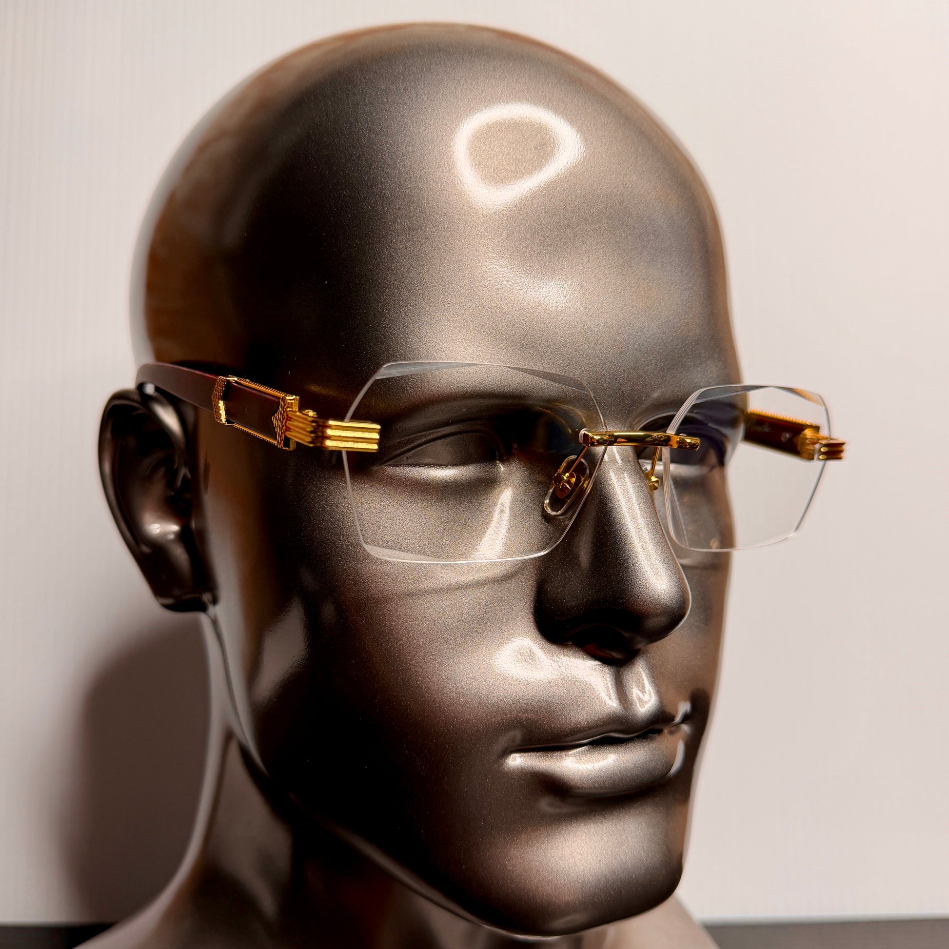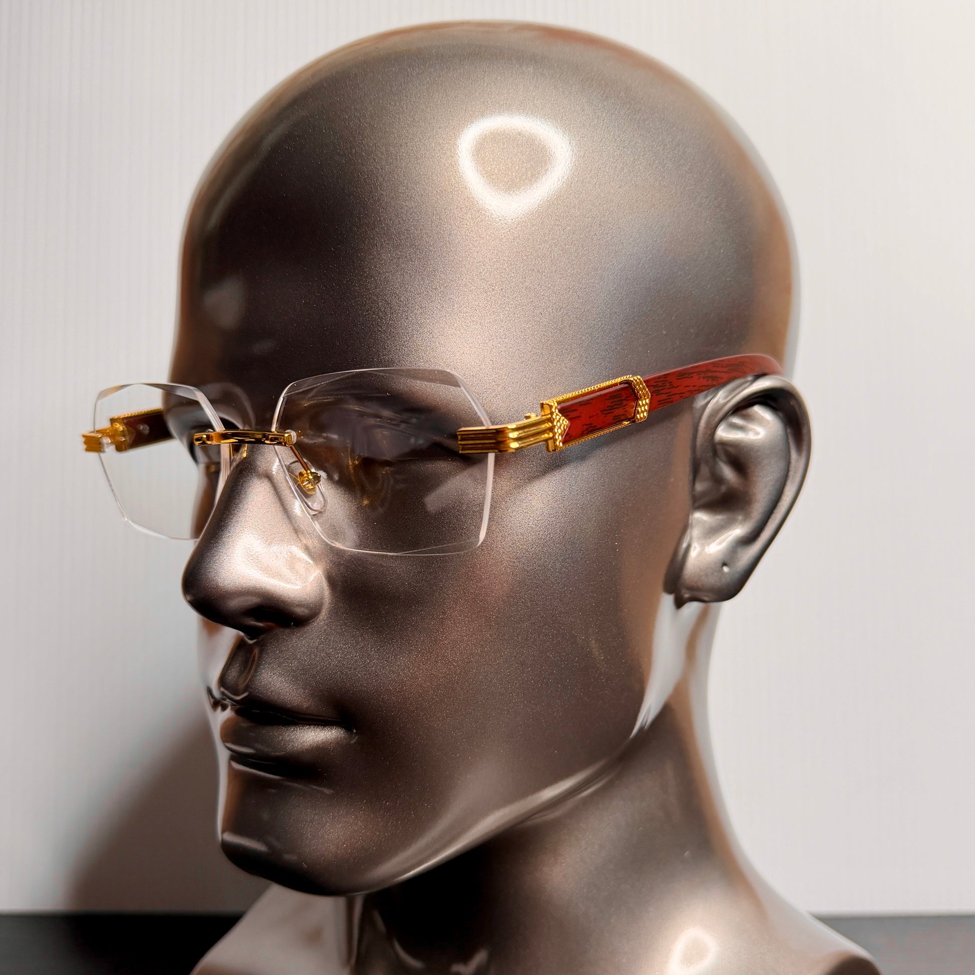 Clear thin square frameless lens with wood legs and gold accents.